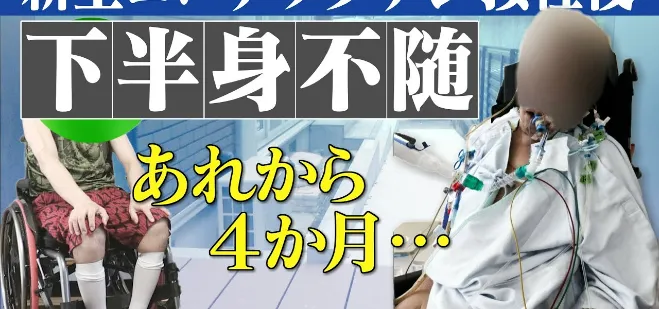 Khoảng 3 tuần sau tiêm, anh ta đột ngột sốt cao gần 40 độ, đồng thời xuất hiện triệu chứng viêm màng não và viêm phổi. Bất tỉnh một giời gian, khi tỉnh lại, anh ta không còn nhớ gì về những sự việc xảy ra sau khi tiêm vắc-xin, và phần thân dưới của anh đã hoàn toàn không thể cử động được.